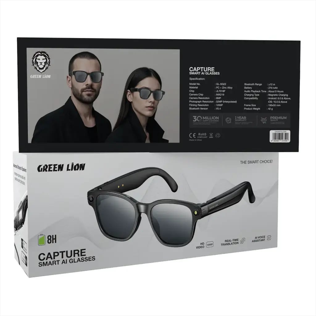 Beyond current smart wearables, the Green Lion Capture smart glasses prioritize AI-powered style. Crafted from polymer-coated plastic and zinc alloy, these glasses offer both durability and modern elegance. Capturing high-resolution photos and 1200p videos with the IMX219 camera chip and 8MP lens (32MP zoom) is effortless, allowing you to capture memories without anyone noticing. To take full advantage of Bluetooth 5.4, which provides an operating range of over 12 meters, you can sync the glasses with your phone for real-time translation, AI-powered voice assistance, and seamless audio playback for up to 8 hours. Magnetic charging ensures a short charging time for extended standby time, so you’ll never be in a rush. The Green Lion Capture smart glasses are designed to seamlessly blend comfort, smart technology, and style.