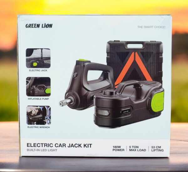 The Green Lion Electric Car Jack Kit is essential since it will be the only tool you need for vehicle maintenance and is meant for easy and quick lifting and tire changing. 180W electric jack generates a fast lift with fish-load-glove effort and can aid a total load of 5 tons. A durable 68.8Ah Li-Ion Polymer battery for a consistent power supply affords multiple usages; this battery works up to three times longer for the car jack and eight hours for the electric wrench. The electric wrench comes with rated power at 80W and 420 Nm of maximum torque, and thus is ideally of use in loosening or tightening bolts easily. The included air pump has 120 maximum pressure and 45 liters per minute of airflow, and thus ensures tire inflation is quick and easy. The other feature of this kit is a built-in LED light for dark places where you should be working; this ensures general safety and visibility while working. The overall combination of this kit is just convenient and powerful, something that every car owner or DIY should have.