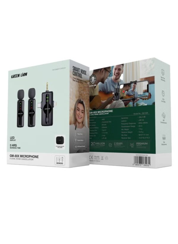 The Green Lion GM-80X Microphone 3 In 1 has excellent sound quality and performance in compact dimensions. With a condenser microphone, the microphone features 360° omnidirectional sound capture, delivering clear sounds in any direction. It features a 65mAh mic battery and 220mAh receiver battery and can be operated continuously for 5 hours with a 1-1.5 hour charge via the Type-C port. With an SNR of ≥75 dB and sensitivity of -38±3 dB, it captures all the subtleties of your voice with HD audio quality. With ultra-low latency of ≤30ms and real-time monitoring, it is perfect for live streaming or recording. With maximum coverage and versatility offered by the dual microphones and LED display, adding a bit of modern touch, it is a plug-and-play device to install and operate. Plus, the reverb mode enhances your audio experience.