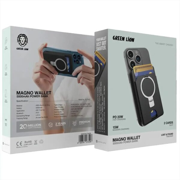 The Green Lion Magno 5000mAh Power Bank is a truly remarkable product, perfectly blending essential features, an attractive design, and smart technology. The power bank is constructed from advanced ABS and aluminum alloy, resulting in exceptional durability while maintaining a sleek and stylish appearance. It boasts 20W PD fast charging and 15W MagSafe wireless charging, enabling it to quickly and efficiently charge multiple devices. With a generous 5000mAh capacity, it’s easily portable in your pocket and provides a full charge for your phone throughout a day of outdoor activities. Furthermore, Bluetooth 5.3 and Apple’s Find My feature make locating and retrieving your lost wallet incredibly easy. The wallet features powerful magnets that securely hold MagSafe-compatible devices, and its stand-like design allows for hands-free use. Additionally, it includes two card slots, making it an ideal travel companion. However, the Green Lion Magno Power Wallet is a suitable handbag candidate; although it is small, its thinness makes it the best accessory that provides the best functionality and highest quality in your daily life.