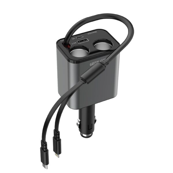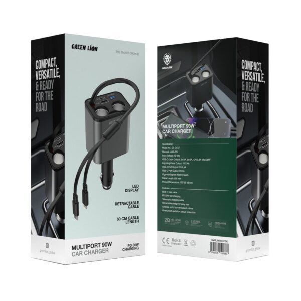 The Green Lion Multiport 90W Car Charger is new, versatile, and robust for your on-the-move lifestyle. This multiport car charger has one built-in fuse cable for safety and reliability. The PD 30W fast charging capability will have your gadgets powered up quickly. It is, therefore, ideal for very long trips or even daily trips to work. This charger has a telescopic charging cable for convenience; its retractable design makes it easy to store and use without clutter. It is designed to charge up to four devices simultaneously and is ideal for families or any group travel, as it will keep everyone powered. The charger is made of ABS+PC material, making it solid. Operating in a wide range of input voltages-from 12 to 24V-essentially makes it fit for most vehicles. The USB-C cable output offers flexible charging options, 5V/3A, 9V/3A, and 12V/2.5A (max 30W); the Lightning cable output delivers 5V/2.4A, as does the USB-A port output for various devices. The USB-C port output also supports 5V/3A, while the function of a cigarette lighter offers 45W for each to support additional charging. You also have an 800mm cable length for extensive reach in your vehicle.