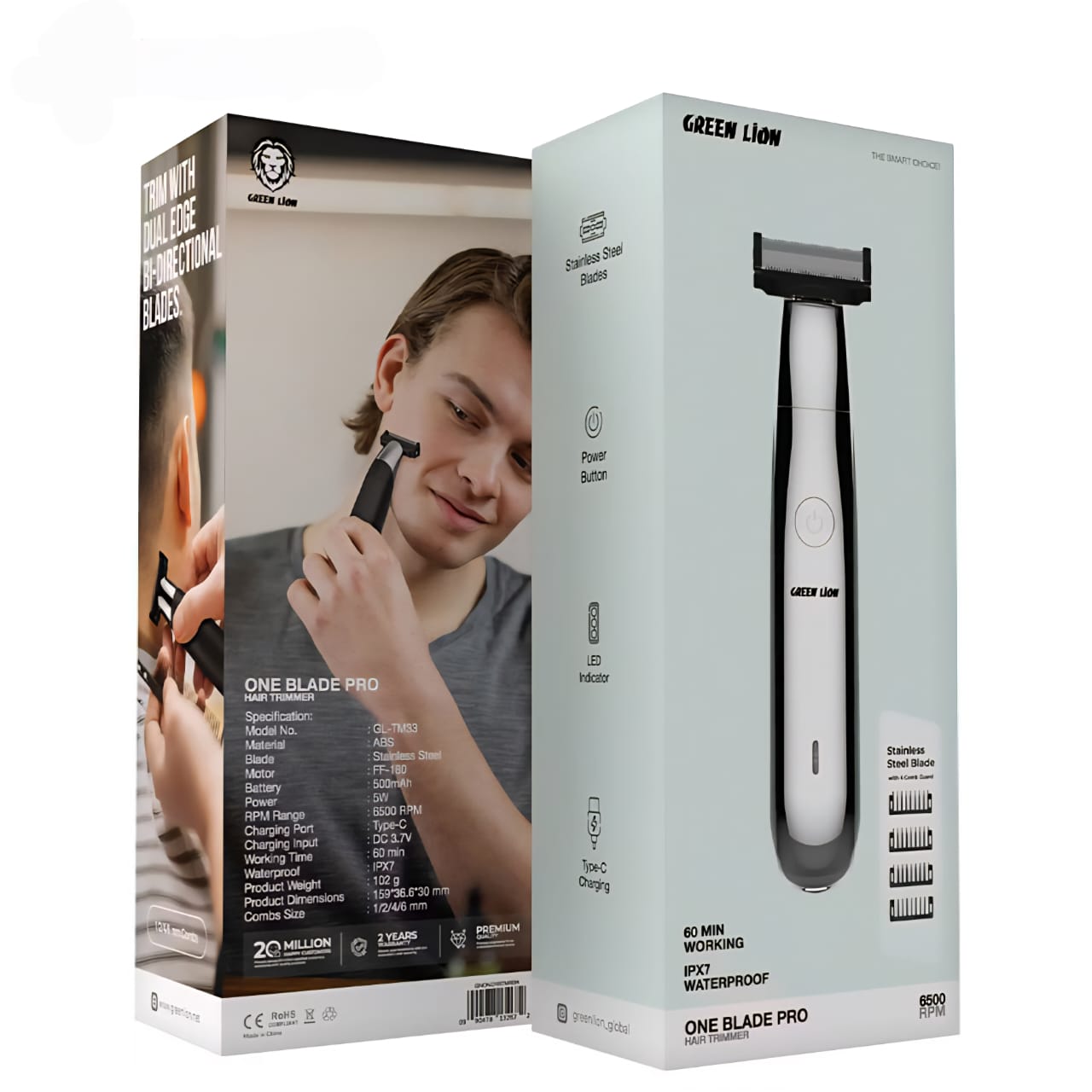 The Green Lion One Blade Pro hair trimmer is a powerful and versatile tool for precise and easy shaving. This trimmer is made of durable ABS and features a stainless steel blade for extra sharpness and a smooth shave. With a 500mAh battery capacity, this trimmer has a 5W output power and a 6500RPM motor speed for efficient shaving. IPX7 water protection allows this trimmer to be used both wet and dry, providing a comfortable shaving experience. The Type-C charging port allows for quick and easy charging with a DC 3.7V input. It also features 1/2/4/6mm combs that make it easy to achieve the desired hair length. The LED indicator shows the battery status and the on/off button ensures convenient use. As your trusted trimmer for safe and easy hair trimming, the Green Lion One Blade Pro is your best shaving buddy