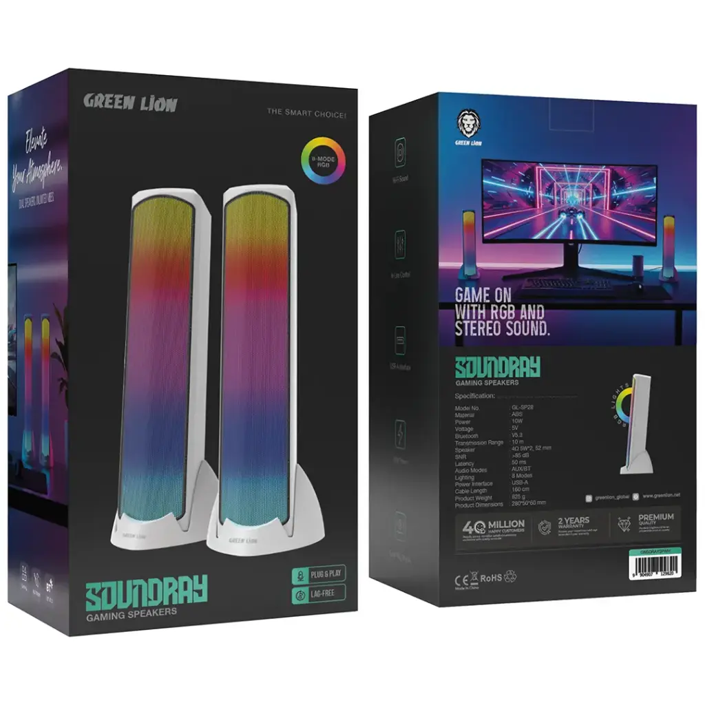 The Green Lion Soundray Gaming Speakers are designed to enhance your gaming and audio experience with powerful 10W sound and stunning 8-mode RGB lighting. With both AUX and Bluetooth connectivity options, these speakers offer flexible audio modes for a seamless, lag-free experience. Bluetooth 5.3 ensures stable wireless connectivity with a 10m transmission range, while the 50ms low latency guarantees no delay during gameplay. Equipped with an in-line control, you can easily adjust the volume and settings with ease. The USB-A interface allows for quick and easy plug-and-play functionality, making it ideal for any setup. These speakers are built with durable ABS material, ensuring long-lasting performance. The 160cm cable length gives you ample flexibility for placement, and the sleek white design adds a modern touch to any gaming or entertainment space. Whether you’re gaming, watching movies, or listening to music, the Green Lion Soundray Gaming Speakers deliver high-fidelity sound and dynamic lighting, making them the perfect addition to your setup.