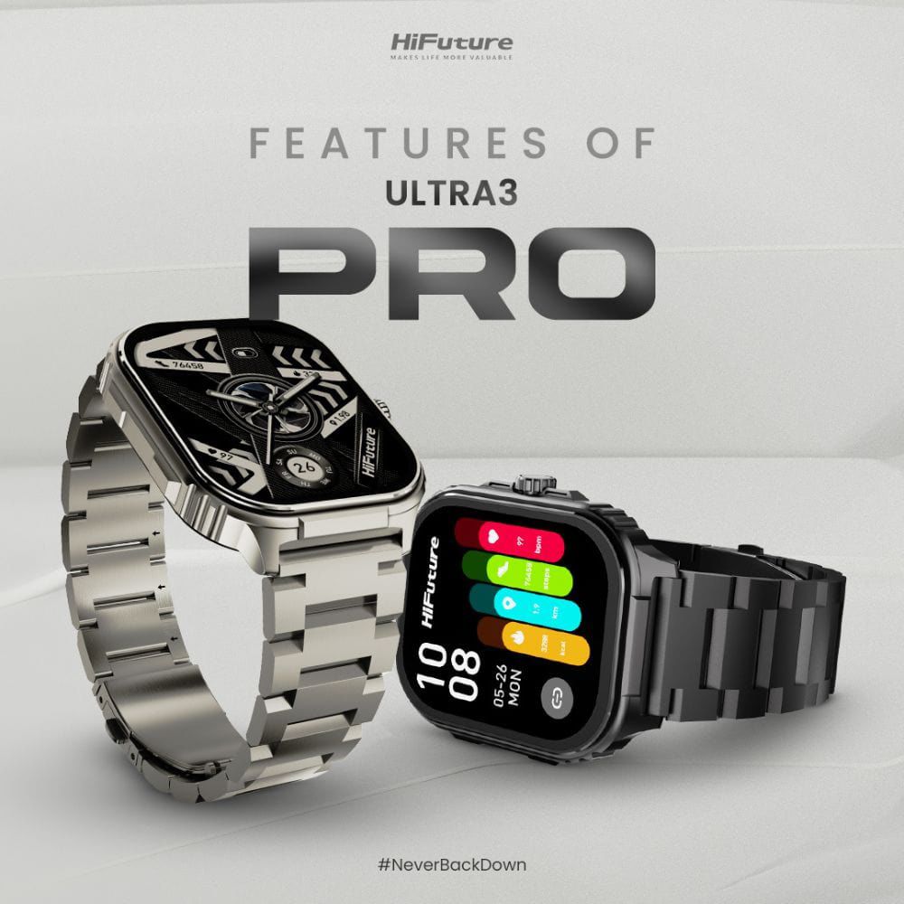 The HiFuture Ultra 3 Pro is a smartwatch featuring a 2.04-inch AMOLED display and a stainless steel frame. Key features include Bluetooth calling, AI-enhanced health monitoring, and an IP68 waterproof rating.