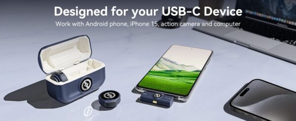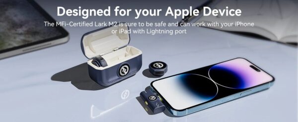 [PLUG&PLAY] The LARK M2 wireless microphone system offers a direct plug on the receiver. It eliminates messy wires and provides a truly wireless recording experience. The receiver of the Lightning version boasts an MFi-certified Apple chip, while the USB-C version is designed for Android phones, Apple 15, action cameras, and computers, giving you a clear and crisp sound output.