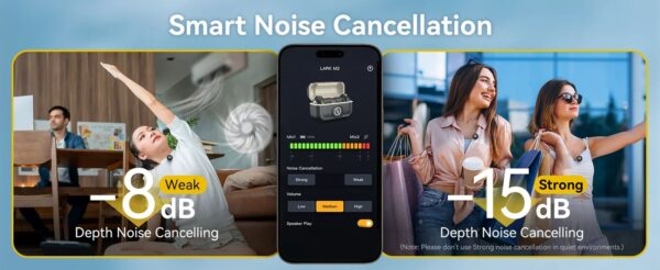 [Smart Control of Noise Cancellation] LARK M2 supports one-click on the yellow button to turn on/off the noise cancellation on TX and RX. The LarkSound app allows you to easily adjust noise cancellation levels (Strong/Low) to fit specific recording needs. Enhanced firmware and audio algorithms ensure crystal-clear, rich, and undistorted human voices, even in noisy environments.