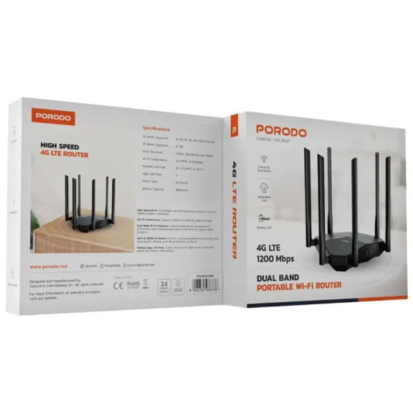 The Porodo Dual Band Portable Wi-Fi Router is an all-purpose, high-capacity wireless device that supports 4G B1/B3/B7/B8/B20/B28/B40 and B41 frequencies, as well as 3G B1 and B8. Using Wi-Fi standards TR5120 and 802.11a/b/g/n/ac via dual bands (2.4 GHz & 5 GHz), the waveforms allow fast and stable connections. The router provides smooth browsing and streaming experiences owing to a 2X2 MIMO setup of AC1200Mbps speed. The router is equipped with 4 antennae for LTE/UMTS and 2 antennae for Wi-Fi with the intention of improving signal reception. Besides that, it provides 3 Giga LAN ports for wired connectivity, making it ideal to be coupled with a large capacity 4000mAh battery that lasts for hours. DC 12V/1A is established as power input; having Nano SIM support and encryption security coupled with reliable signal strength makes this ideally suited for home, travel, and business.