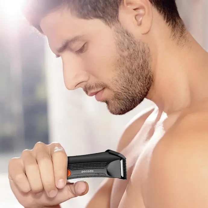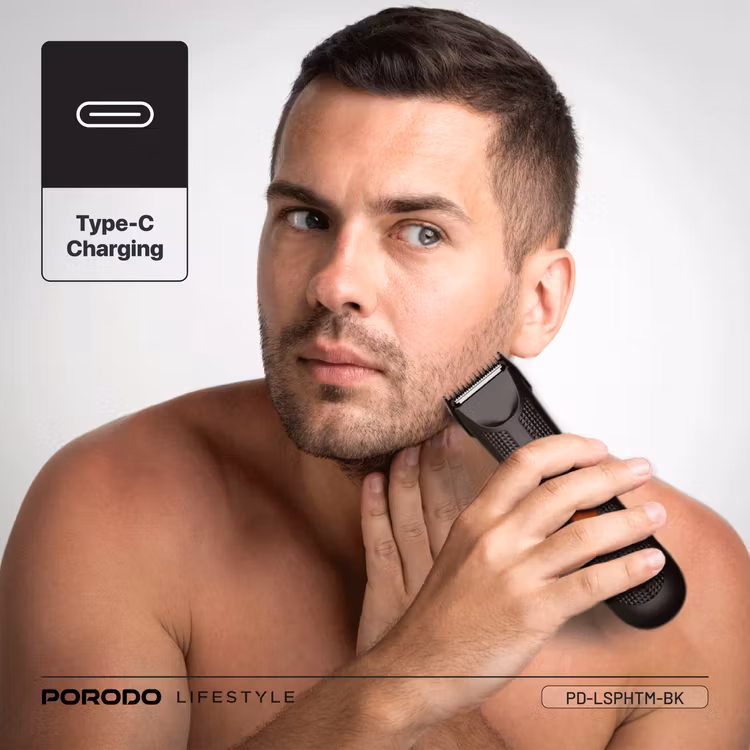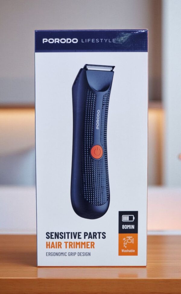 The Porodo Lifestyle Sensitive Parts Hair Trimmer features an ergonomic grip design for precise and comfortable usage. With Type-C charging, it offers convenience and efficiency. Its lightweight, IPX5 water-resistant, and washable design ensures durability and ease of use.