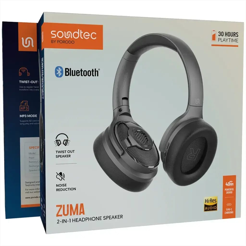 The Porodo Soundtec Zuma 2-IN-1 Headphone Speaker is a device that gives you multiple options of how to use its sound. The design of the speaker that flips out is very innovative, so you can have singing in high-quality sound with it as a headphone, then the speaker can be flipped out for a group of people to listen to and enjoy music. Headphone mode allows 30 hours of playtime, and speaker mode 5 hours, so during long trips, relaxations, or sharing music with friends, this product is just right for all these activities. The existing active noise reduction guarantees sound that is very rich and immersive, plus the very large driver of 40mm ensures very loud and full-range audio. FM radio function is on hand for you to listen to your favorite stations and also the MP3 mode that supports SD card playback so that you can keep on listening to your music collection without being interrupted. With the help of Bluetooth 5.4, enjoy wireless connection without interruptions and make hands-free phone calls. The Type-C charging makes the recharging fast, thus giving you more time for your music wherever you are going to.